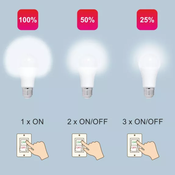 Prima secventa aprinde becul la 100% din intensitatea luminoasa, cea de-a doua secventa reda 50%, iar cea de-a treia secventa ofera 25% din intensitatea luminoasa.