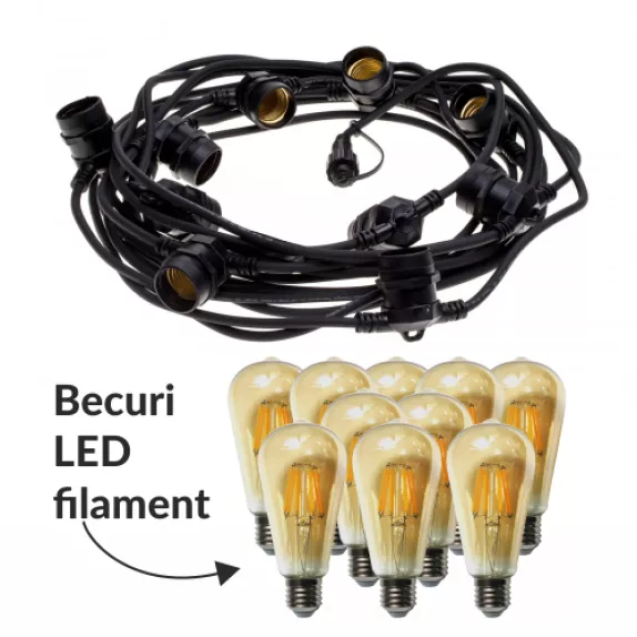 Pachet ghirlanda 10m, E27, IP65 cu 10 becuri LED Filament Amber ST58 2W