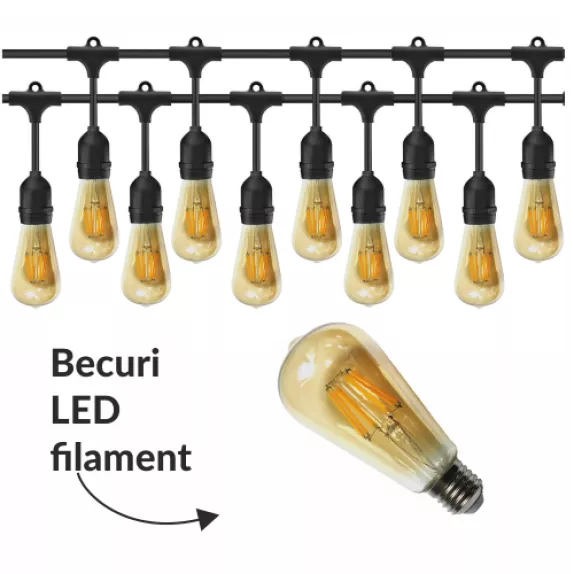 Pachet ghirlanda cu pendule 10m, E27, IP65 cu 10 becuri LED Filament Amber 8W